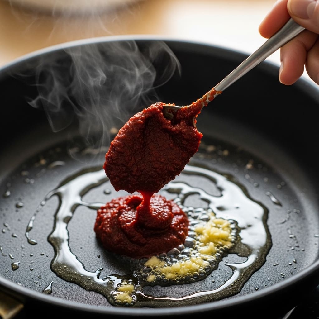 고기가 익은 후 바로 물을 넣는 것이 아니라, 고추장과 고춧가루, 마늘을 먼저 볶아야 한다. 이 과정에서 고추장의 날맛이 사라지고 깊은 풍미가 형성된다. 이때 불은 약불을 유지해야 양념이 타지 않는다.