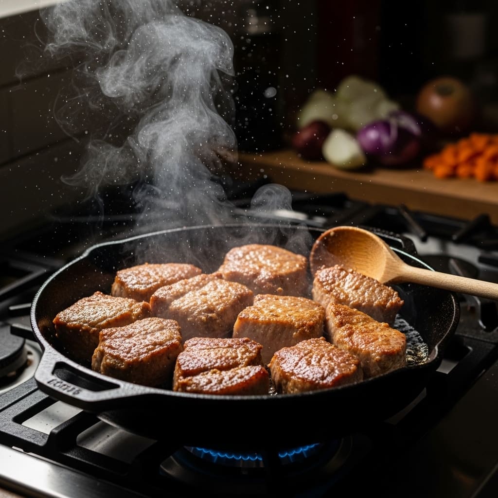 고추장찌개의 가장 중요한 단계는 고기를 먼저 볶는 과정이다. 고기를 그냥 넣고 끓이는 것이 아니라, 먼저 볶아야 고기의 기름과 풍미가 국물에 잘 녹아든다. 특히 삼겹살을 노릇하게 볶으면 고소한 맛이 살아나고, 이후 넣는 고추장과 잘 어우러진다.