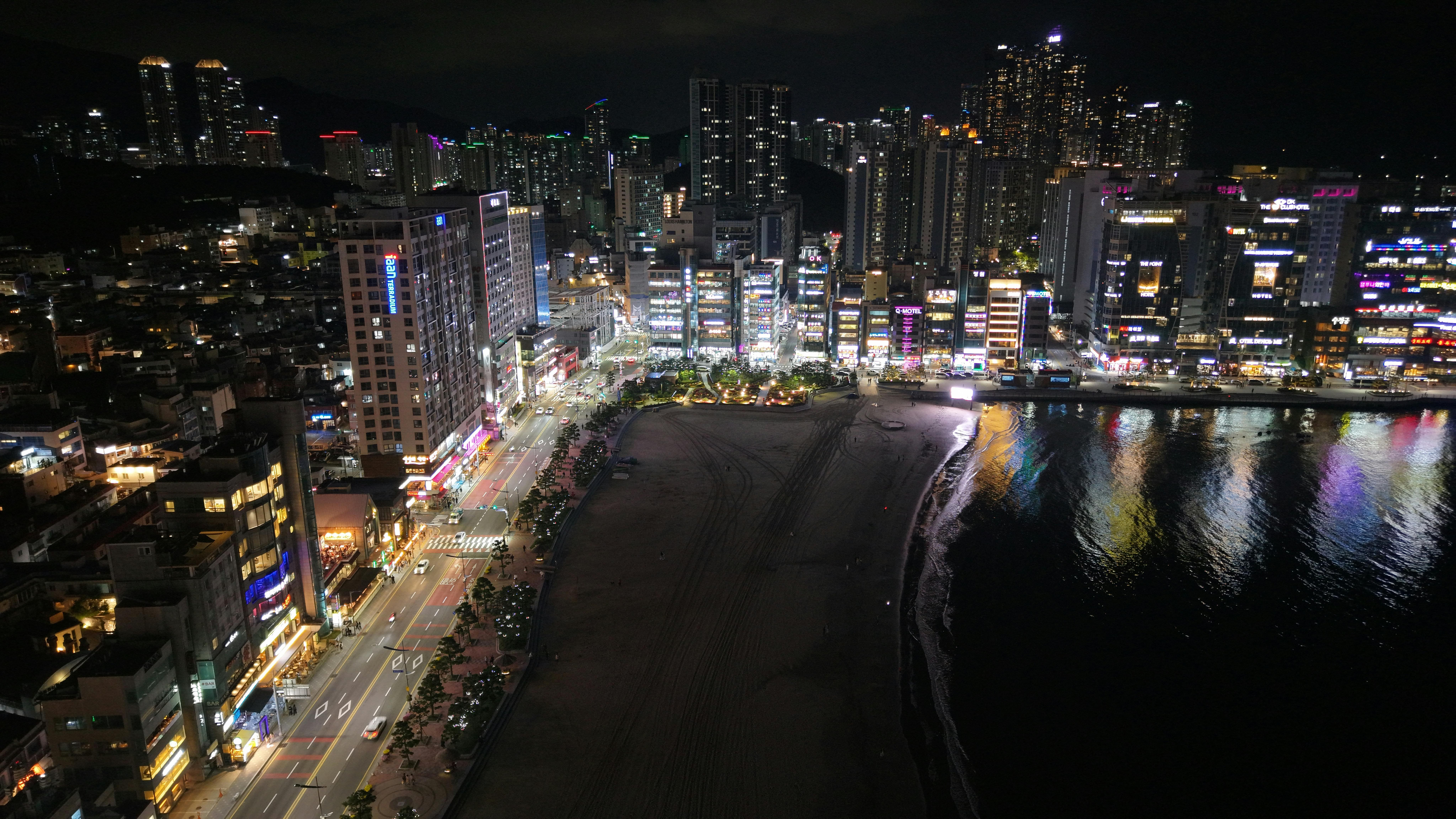 - 해질 무렵 하늘 색이 바뀌며 도시 불빛과 바다의 조화가 돋보입니다.